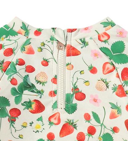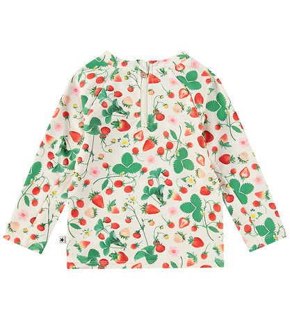 Charming Molo swim top in white with a print of strawberry, leaves and flowers. The Swim tops has a round neckline with a card zipper at the neck and long sleeves.
