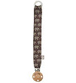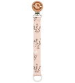 Fine Müsli pacifier clip in pink with floral print in brown and white.