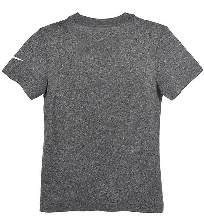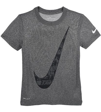 Cool Nike t-shirt in melange dark grey with a large, vertical logo print on the front in black and dark grey. On the left upper arm there is a white logo print.