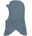 Cute Racing Kids balaclava in a striped design with navy blue and cream white and a logo application on the top.