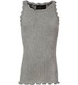 The Rosemunde top is sleeveless and has a wide shoulder strap on the right side. At the bottom, the top has a wavy edge and it is in a soft and stretchy cotton quality, with a tight fit.