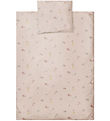 Fine Smallstuff bedding in dusty pink with an allover print of different dolls.