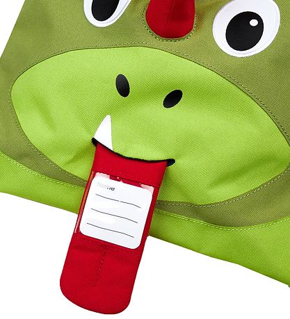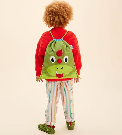 Adorable Affenzahn gymsack in shades of green with a shape like a dragon. In front there are two serrated dicks, two ears, two large eyes and a mouth that sticks out a tongue. The tongue is attached with an elastic band, and when you pull it, a name tag comes into view.
