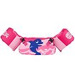Nice BECO learn to swim set consisting of a flotation belt and water wings. The swimming belt is pink with a print of a blue dolphin on the front. The swimming fins are in different shades of pink with the BECOS logo in white.