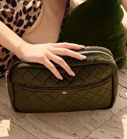 Nice Fan Palm toiletry bag in dark green velvet with a nice quilted pattern.