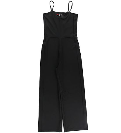 The Fila jumpsuit has long wide legs. The jumpsuit has narrow, adjustable shoulder straps, and it has a straight cut, so it resembles a dress.