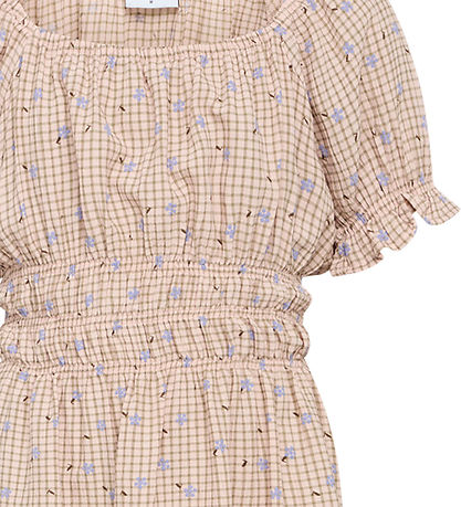 Adorable Grunt dress in light rose with green checs and an all-over-print of purple flowers.