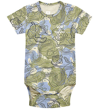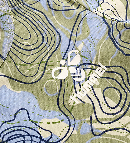 Beautiful Hummel bodysuit in dusty green with an all-over-print in blue, navy and off white. On the left chest there is a logo print in white.