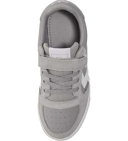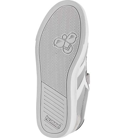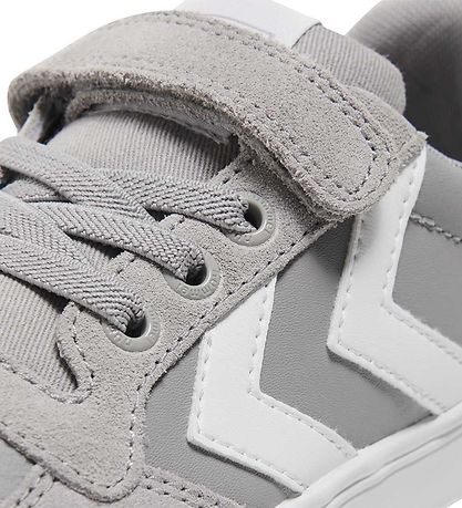 Cool Hummel shoe in grey leather with suede details, and on both sides of the shoes are the well-known Hummel shevrons in white. On the heel there is a navy logo.