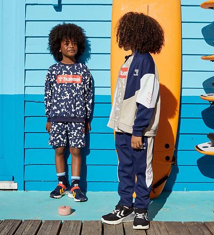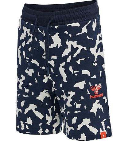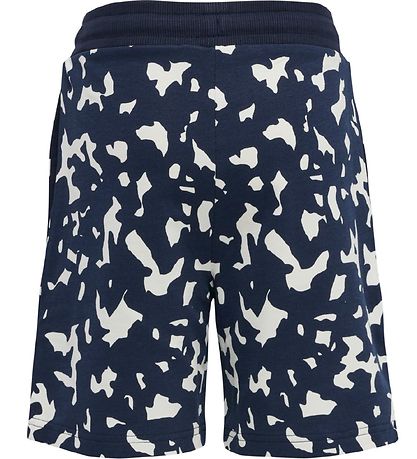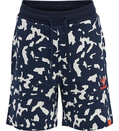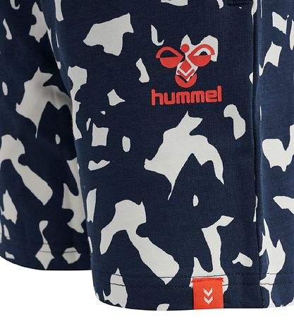 Cool Hummel shorts in navy with an all-over white pattern. On the left trouser leg there is a red print of the well-known Hummel- bee with the name "Hummel" below.
