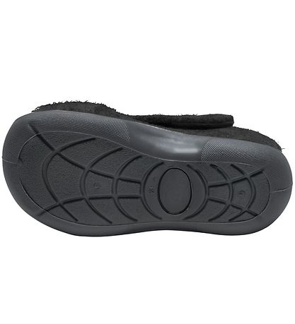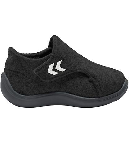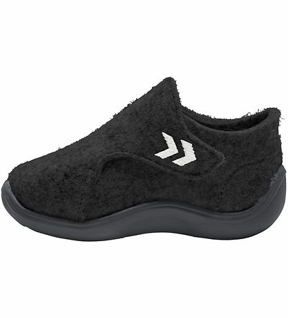 Cute Hummel slippers in black wool with charcoal gray outsole. Both on the inside and outside of the slippers, the familiar chevrons are embroidered in white, and also there is Hummel on the heel.