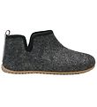 Smart Hummel slippers in black wool with brown outsole. On the heel there is a strap with the familiar shevrons in black and white and in the opening there is a black edge.