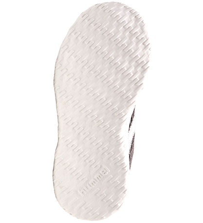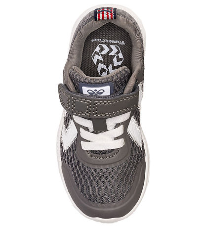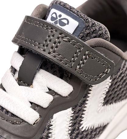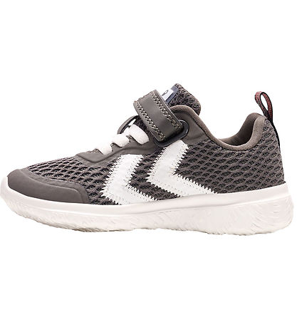 Great Hummel sneakers in grey mesh and rubber overlays. On the outer and inside are the characteristic shevrons in white. At the top of the tongue is a white label with the Hummel logo in white.