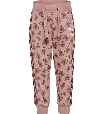 Fine Hummel trousers in pink with an all-over floral print in dark pink and green, and the characteristic Hummel shevrons in pink and silver glitter along the legs on each side. There is also a white logo print on the left thigh.