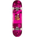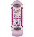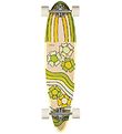 The Impala skateboard is made of maple and has a "kicktail" back and a rough surface. On the underside there are Slant Surf/Skate trucks.