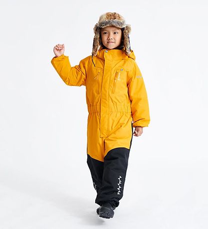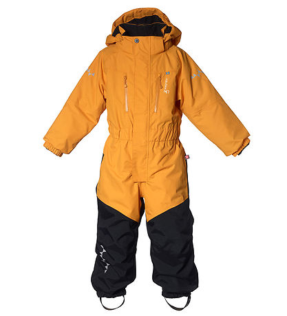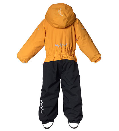 Beautiful Isbjörn of Sweden snowsuit in dark yellow and black. The Snowsuit has white logo print on the left chest and the hood, as well as smart reflective prints on the lower back, both shoulders and ankles.