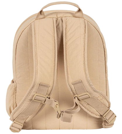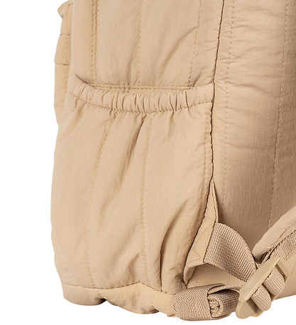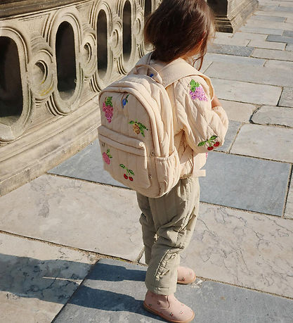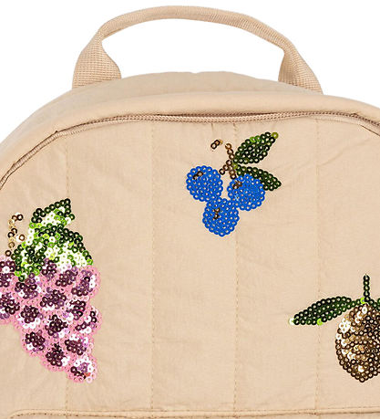 Cute Konges Sløjd backpack in light beige with a colorful sequin print of various fruit motifs. The Backpack has a quilted structure.