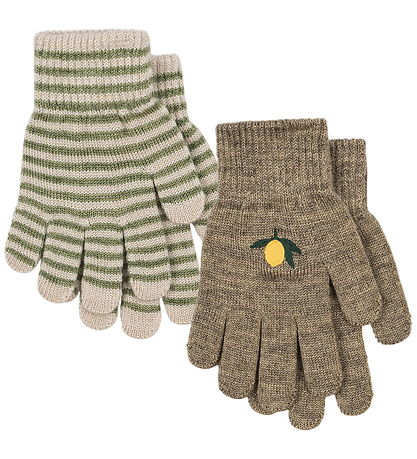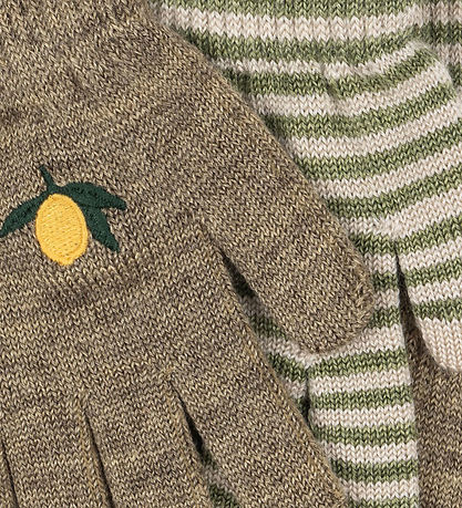 Smarte Konges Sløjd gloves sold in a 2-Pack. One with green and beige stripes, and one in green-brown with an embroidered lemon print.