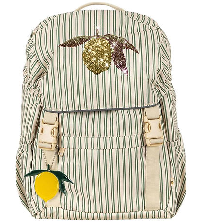 Smart Konges Sløjd school backpack in a light beige, and has green stripes and a nice lemon print of sequins on the front. The school backpack includes a gym bag and a rain cover for the school backpack.