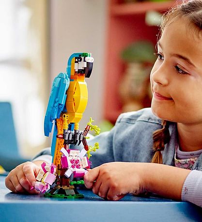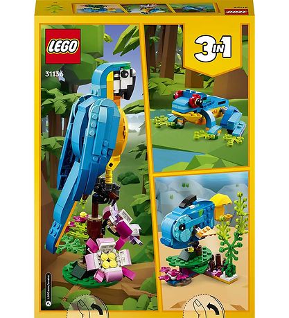 Exciting LEGO® Creator set with a total of 253 blocks, which can be assembled into three different things: a parrot that can turn on its branch and move sine wings and tail, a fish that can lift sine fins and move up and down, or a frog that has moveable legs.