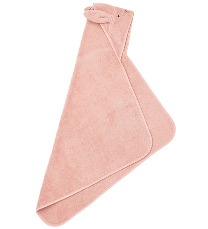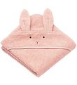 Beautiful Liewood Baby towel in pink with an embroidered rabbit face and ear on top of the hood.