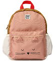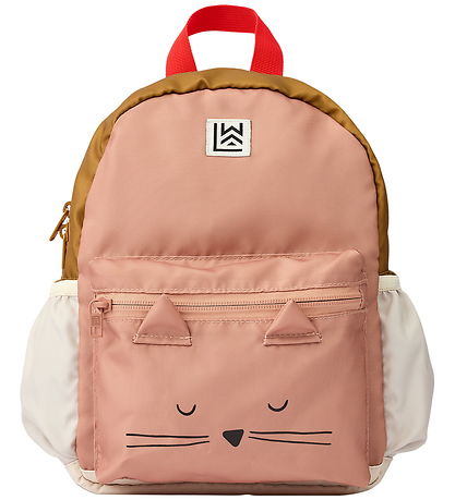 Nice Liewood backpack in pink with colorful details and a cat print on the front.