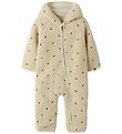 The Lil' Atelier pramsuit has a removable hood that is Fast with hidden push buttons, and it has narrow, elastic edges and practical folds at the hands and feet. The Pramsuit opens with a zipper at the front and down the left leg, and it has a chin guard and an internal wind pole. The Pramsuit has soft teddy fleece on the inside.