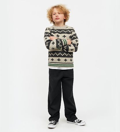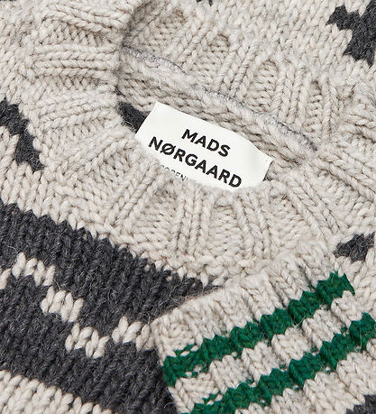 Charming blouse from Mads Nørgaard with a beautiful knitted pattern. The Blouse has long sleeves and a round neckline. The Colours are in neutral tones of grey and white with small, stylish cross patterns. The design is completed with green stripes at the bottom, which gives an extra touch.