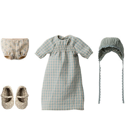 Nice Maileg rabbit in beige wearing a beautiful dress, a cute hat, underwear and small shoes.