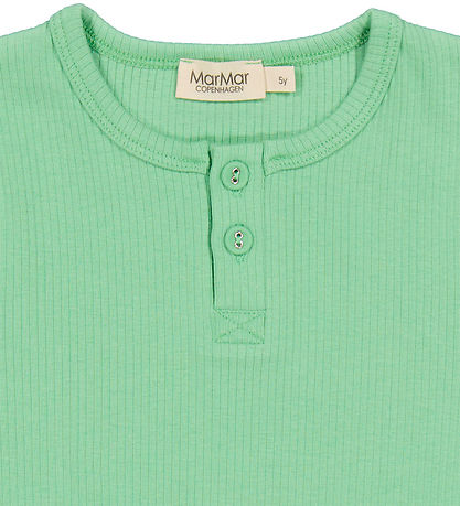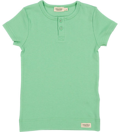 Beautiful MarMar t-shirt in green ribbed quality with two fine fabric-covered buttons at the front.