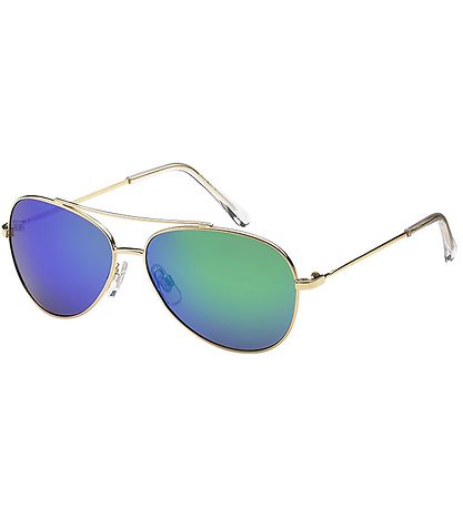 Beautiful Mokki sunglasses with a gold-colored frame and blue-green spectacle lenses.