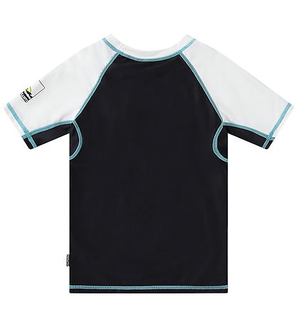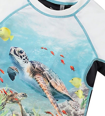 Beautiful Molo swim top with an underwater print of various fish and sea turtles. The Swim tops has a round neckline and short sleeves.