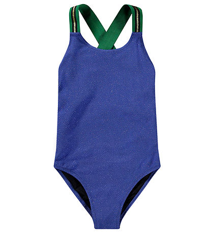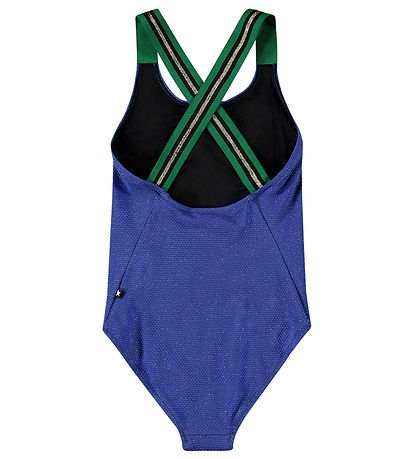 Beautiful Molo swimsuit in blue with gold glitter and striped shoulder straps in dark green, black and gold.
