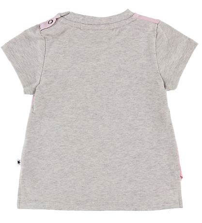 The Molo T-shirt has short sleeves with a ribbed edge at the neckline. The T-shirt has a high-low effect and opens at the left shoulder with press studs.