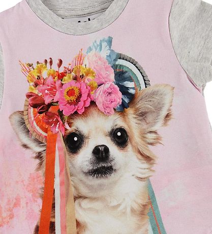 Cute Molo T-shirt in mottled gray with a photo print on the front of a nice Chihuahua with flowers on his head, standing in front of a rose background.