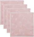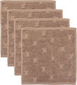 Practical Müsli washcloths sold in a 4-Pack in light brown with a pattern of small, embossed stars. The Müsli washcloths have a square shape and are made of soft terrycloth.