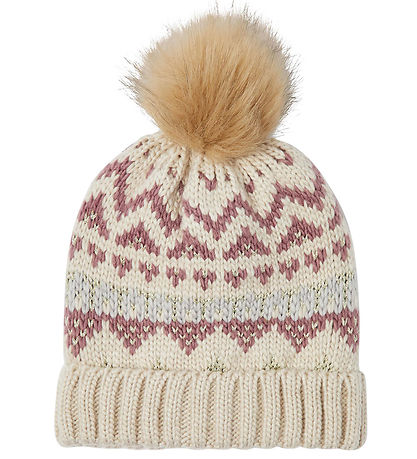 The Name It beanie consists of two layers, of which the outer one is of knitted quality, and the inner one is in soft fleece. At the bottom there is a wide ribbed edge, and at the top there is a beige pom-pom in faux fur.