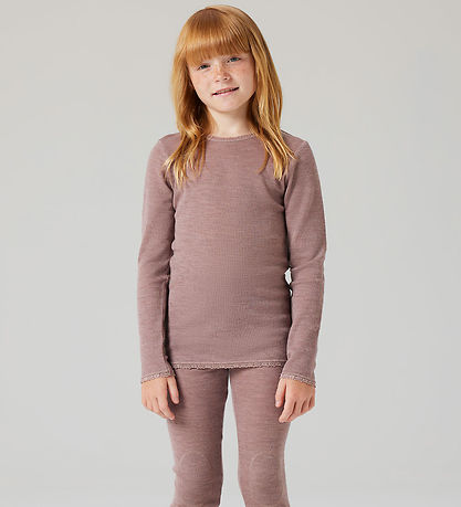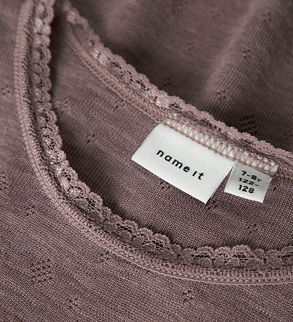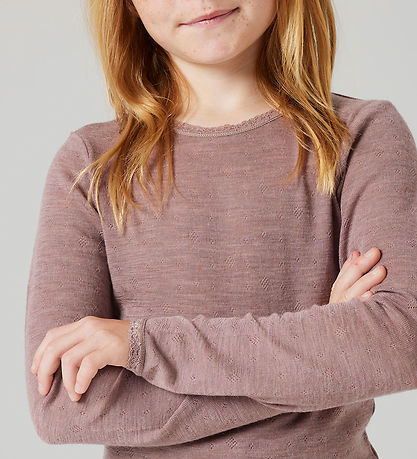Elegant Name It blouse in a soft dusty purple shade. The Blouse has long sleeves and a round neckline, which is nicely finished with a discreet lace detail. The fabric is decorated with a discreet pointelle, which adds a little structure. The Blouse is made with lovely merino wool.