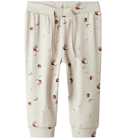 Charming trousers from Name It in a light beige colour with a fun print of small coconuts scattered across the fabric. The Trousers have an adjustable elastic waist and decorative drawstrings at the front.