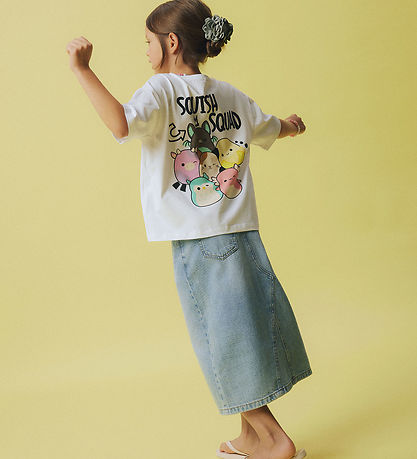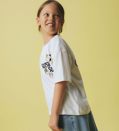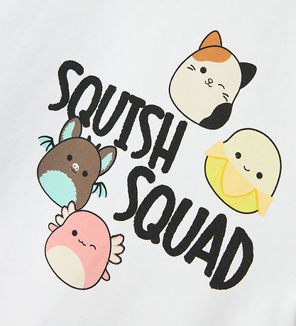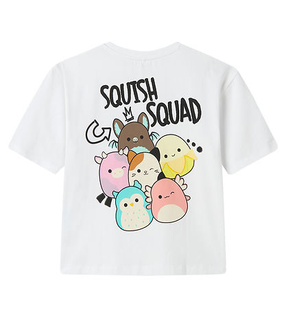 Smart Name It t-shirt in white, with a smaller print on the front and a larger one on the back, with motifs of colorful Squishmallows and the text "Squish Squad". The Name It t-shirt has a loose fit and is shorter than a normal t-shirt.