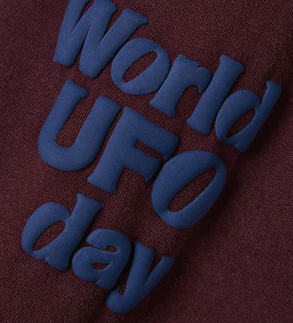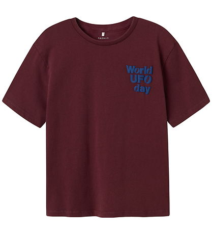 Stylish Name It t-shirt in a deep, burgundy red colour. The T-shirt has a print with text on the front and back, which says "World UFO day" in a ready, blue shade. The Name It t-shirt has a classic round neckline with a narrow ribbed edge that ensures a comfortable fit.