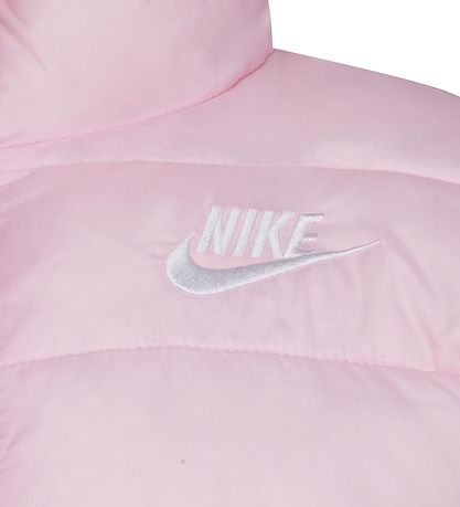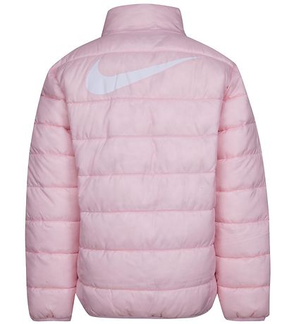 Cool Nike puffer jacket in pink with a silver grey zipper and horizontal stitching. The down jacket has a white embroidered logo on the left chest and a large white logo print on the back.