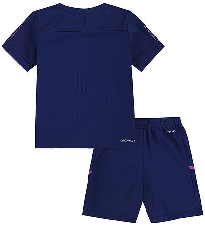 Cool Nike shorts set consisting of a t-shirt and a pair of shorts in blue with a print of football player Kylian Mbappé's initials, flames and the Nike logo.