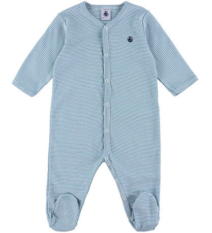 Charming Petit Bateau nightsuit with narrow stripes in blue and white, giving it a classic look. A little logo print in navy from Petit Bateau adorns the left chest.