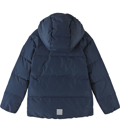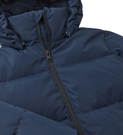 Lovely Reima down jacket in uniform navy blue with horizontal stitching and black zippers.