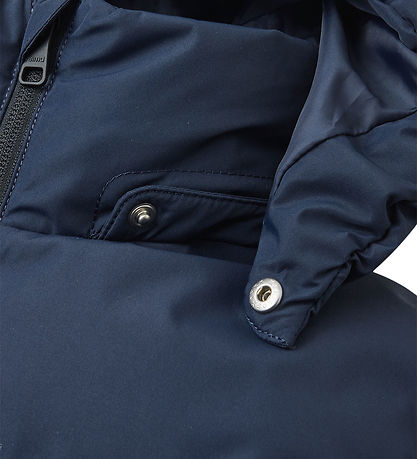The Reima down jacket has a removable hood that is attached along the high collar with hidden push buttons. The sleeves have inner elastic.