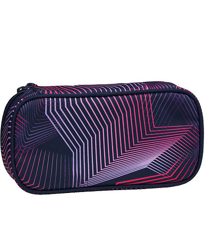 Nice Satch pencil case in dark purple with a neon pink pattern of seismic stripes and a large, pink logo print.