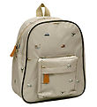 Beautiful Smallstuff preschool backpack in a dusty army green shade with a cute print of small emergency craft.