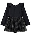 Elegant Sofie Schnoor gymsuit with long sleeves in black. The leotard has cute ruffles at the shoulders and a beautiful tulle skirt with glittering details, perfect for playing and dance.