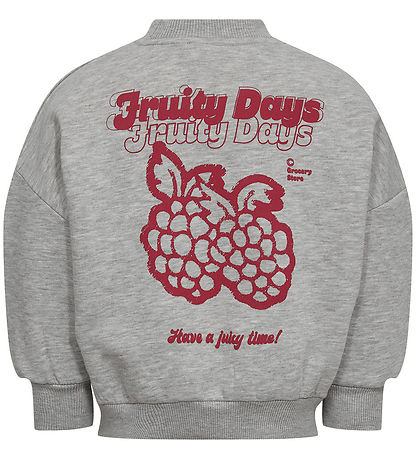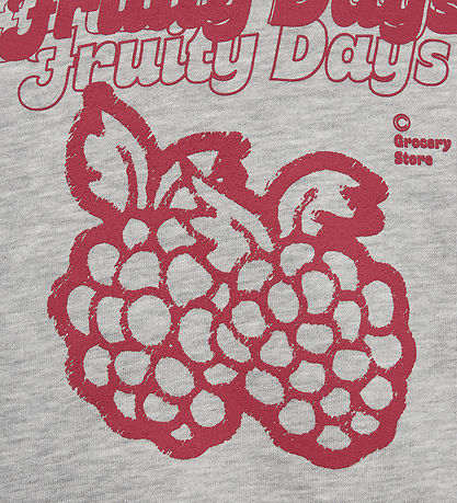 Nice Sofie Schnoor sweatshirt in plain melange grey. On the front, on the left is a little red "Fruity Days" text print. On the back is a large, red berry print with "Fruity Days" above and "Have A Juicy Day" below.